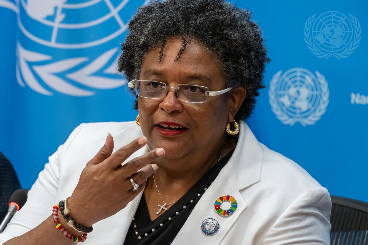 Mia Amor Mottley, Prime Minister of Barbados and Chair of the Global Leaders Group on Antimicrobial Resistance (AMR Leaders), briefs the press ahead of the Antimicrobial Resistance (AMR) High-Level Meeting. AMR Leaders is group of world leaders and experts from various sectors, working to accelerate political action on antimicrobial resistance.