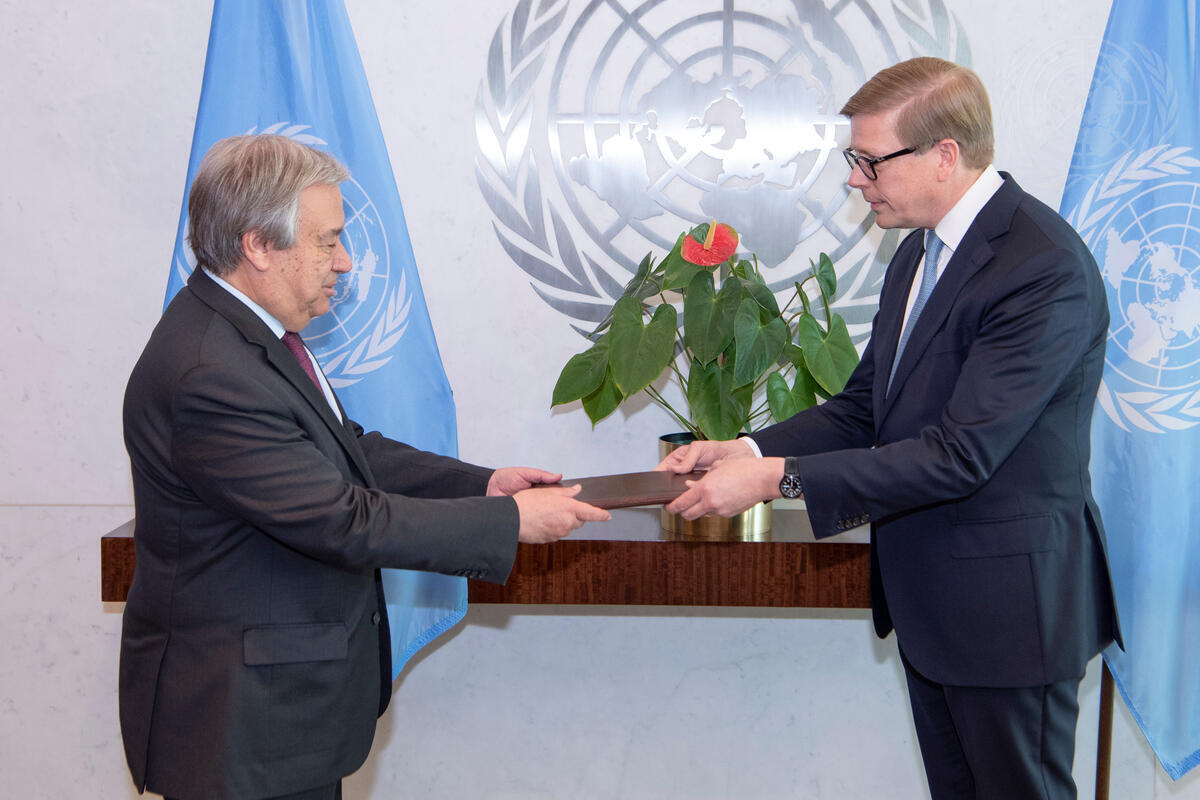 Jukka Salovaara (right), new Permanent Representative of the Repulic of Finland to the United Nations, presents his credentials to Secretary-General António Guterres.