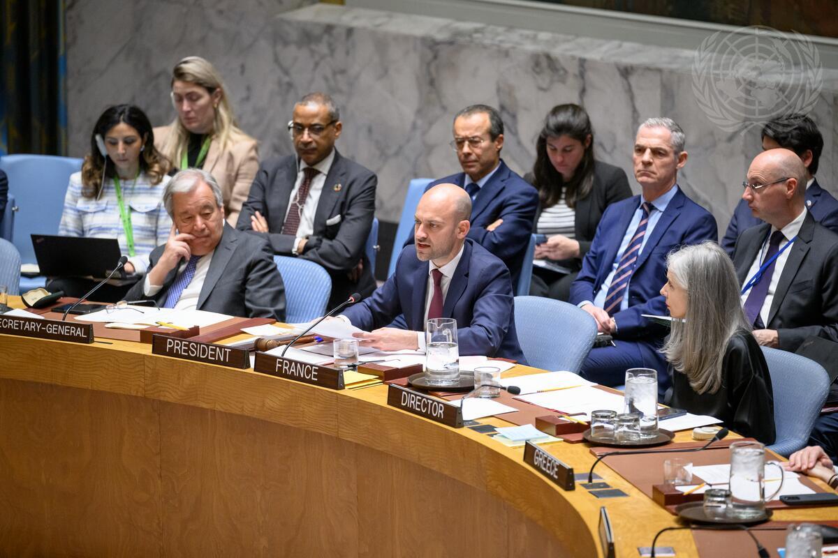 Jean-Noël Barrot (centre at table), Minister for Europe and Foreign Affairs of France and President of the Security Council for the month of April, chairs the Security Council meeting on the situation in the Middle East, including the Palestinian question. At left at the table is Secretary-General António Guterres and at right is Claudia Banz, Director of the Security Council Affairs Division of the Department of Political and Peacebuilding Affairs (DPPA).