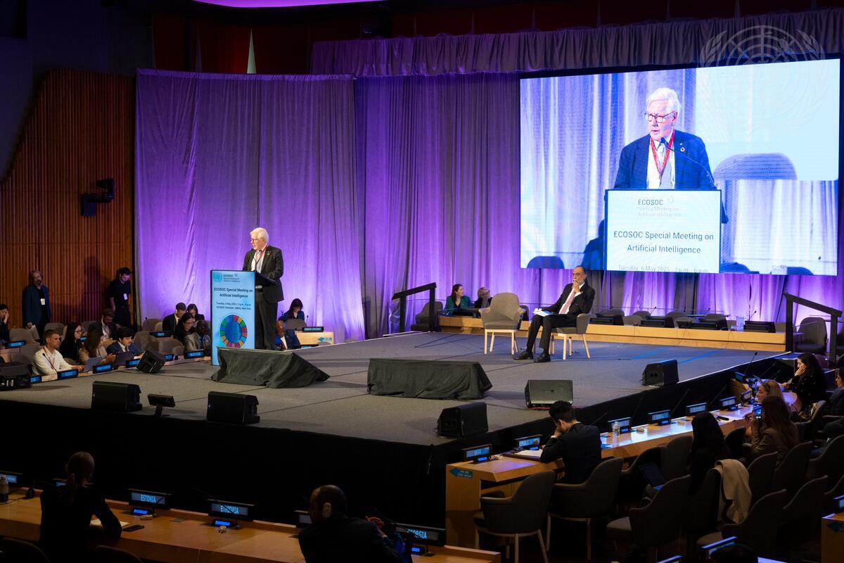 Robert Rae (at podium and on screen), President of the Economic and Social Council (ECOSOC), speaks during the STI Forum Action Day on Advancing the Global Digital Compact.