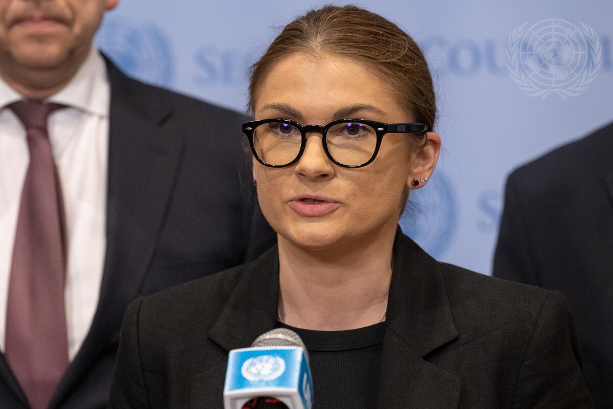 Khrystyna Hayovyshyn, Chargée d'Affaires of the Permanent Mission of Ukraine to the United Nations, briefs reporters at UN Headquarters.