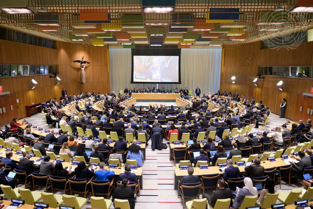 A wide view of the informal meeting of the General Assembly plenary that heard a briefing by Secretary-General António Guterres (on screen) on the UN80 Initiative.