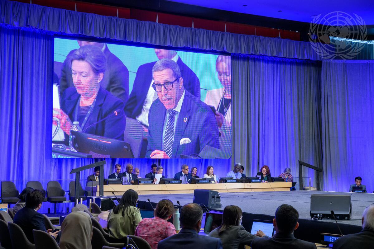 Omar Hilale (on screen), Permanent Representative of Morocco to the United Nations, speaks during the tenth multi-stakeholder forum on science, technology and innovation for the Sustainable Development Goals on the theme: “Advancing sustainable, inclusive and evidence-based, science and technology solutions and innovations for the 2030 Agenda and its SDGs for leaving no one behind”.