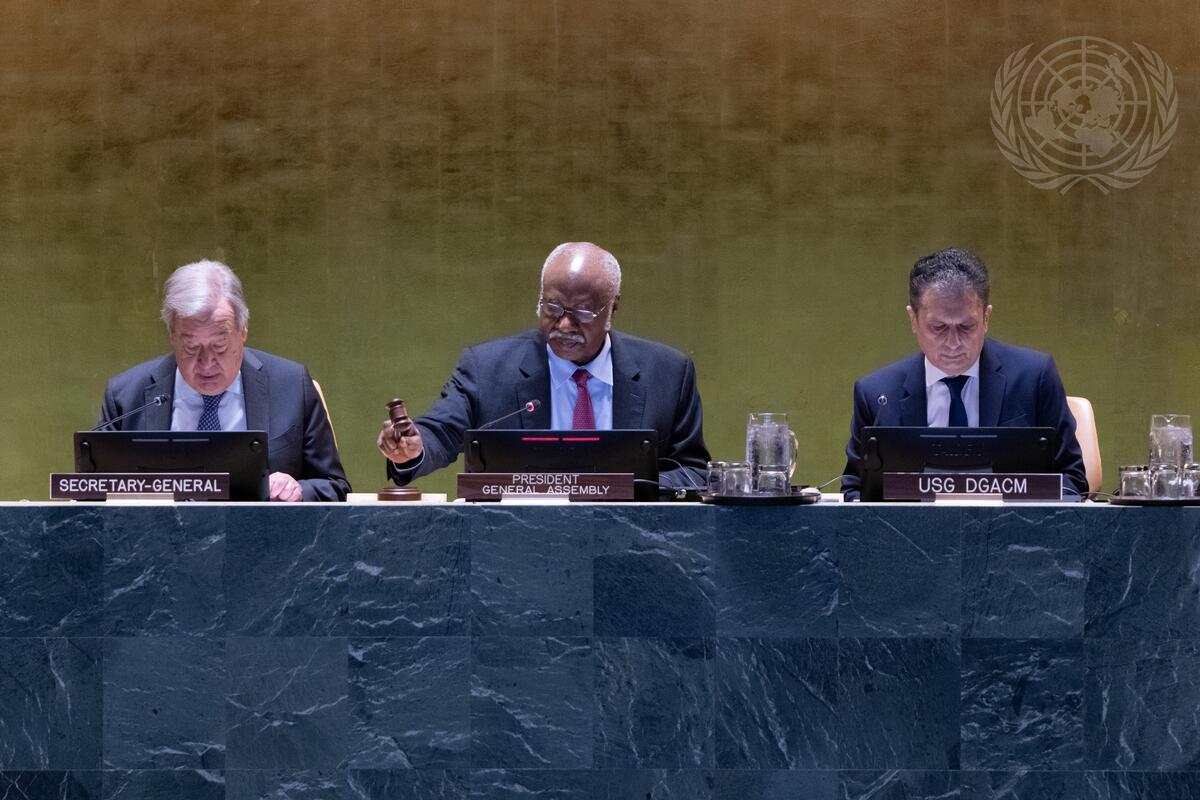 Philemon Yang (centre), President of the seventy-ninth session of the United Nations General Assembly, chairs the informal meeting on the observance of the annual Nelson Mandela International Day. At left is Secretary-General António Guterres and at right is Movses Abelian, Under-Secretary-General for General Assembly and Conference Management (DGACM).
