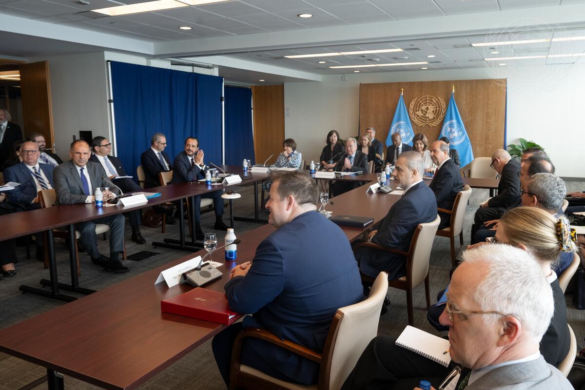 Participating in the meeting (at the table) are, from left to right: Georgios Gerapetritis, Minister for Foreign Affairs of the Hellenic Republic; Nikos Christodoulides, Leader of the Greek Cypriot Community; Rosemary DiCarlo, Under-Secretary-General for Political and Peacebuilding Affairs; Mr. Guterres; María Angela Holguín Cuéllar, Personal Envoy of the Secretary-General on Cyprus; Ersin Tatar, Leader of the Turkish Cypriot Community; Hakan Fidan, Minister of Foreign Affairs of Türkiye; and Stephen Doughty (right), Minister of State for Europe, North America and Overseas Territories in the Foreign, Commonwealth and Development, United Kingdom of Great Britain and Northern Ireland.