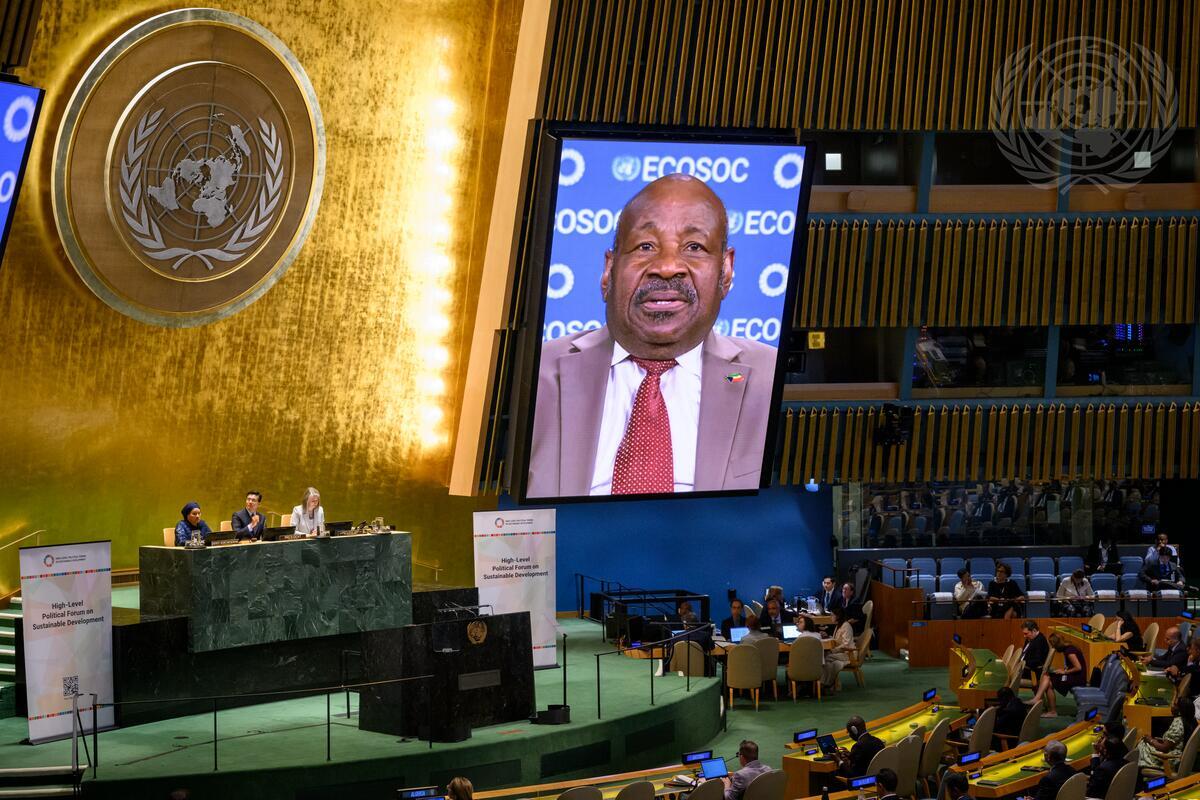 Anatolio Ndong Mba (on screen), Vice-President of the United Nations Economic and Social Council (ECOSOC) and Permanent Representative of the Republic of Equatorial Guinea to the United Nations, delivers a message during the 1st meeting of the high-level political forum on sustainable development convened under the auspices of the Economic and Social Council (14-23 July).