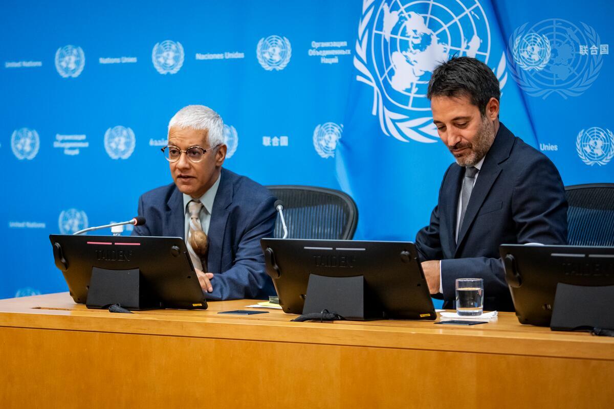 David Nanopoulos (right), Chief of the Treaty Section in the Office of Legal Affairs, briefs reporters ahead of the annual treaty event "Eighty Years of Multilateral Treaty Making at the United Nations", which will be held from 23-26 September 2025. At left is Farhan Haq, Deputy Spokesperson for the Secretary-General.