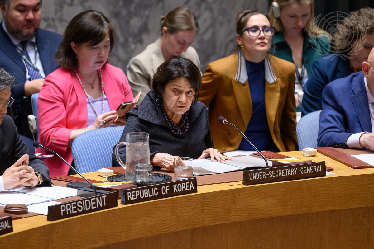 Rosemary DiCarlo, Under-Secretary-General for Political and Peacebuilding Affairs, briefs the Security Council meeting on threats to international peace and security.