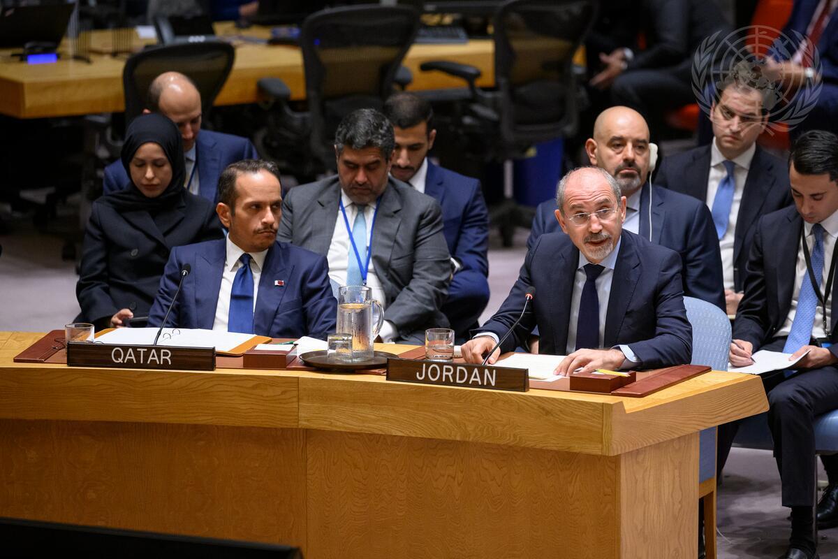 Ayman Safadi (right), Deputy Prime Minister and Minister for Foreign Affairs and Expatriates of the Hashemite Kingdom of Jordan, addresses the Security Council meeting on the situation in the Middle East. At left is Sheikh Mohammed bin Abdulrahman bin Jassim Al-Thani, Prime Minister and Minister for Foreign Affairs of the State of Qatar.
