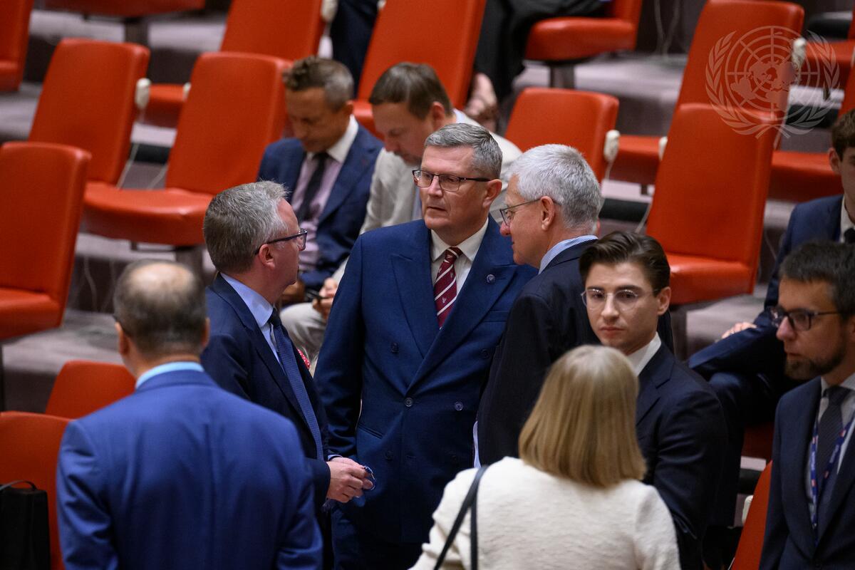 Marcin Bosacki (centre facing camera), Secretary of State of Poland, speaks with Krzysztof Maria Szczerski (second from left), Permanent Representative of the Republic of Poland to the United Nations, ahead of the Security Council meeting on threats to international peace and security.