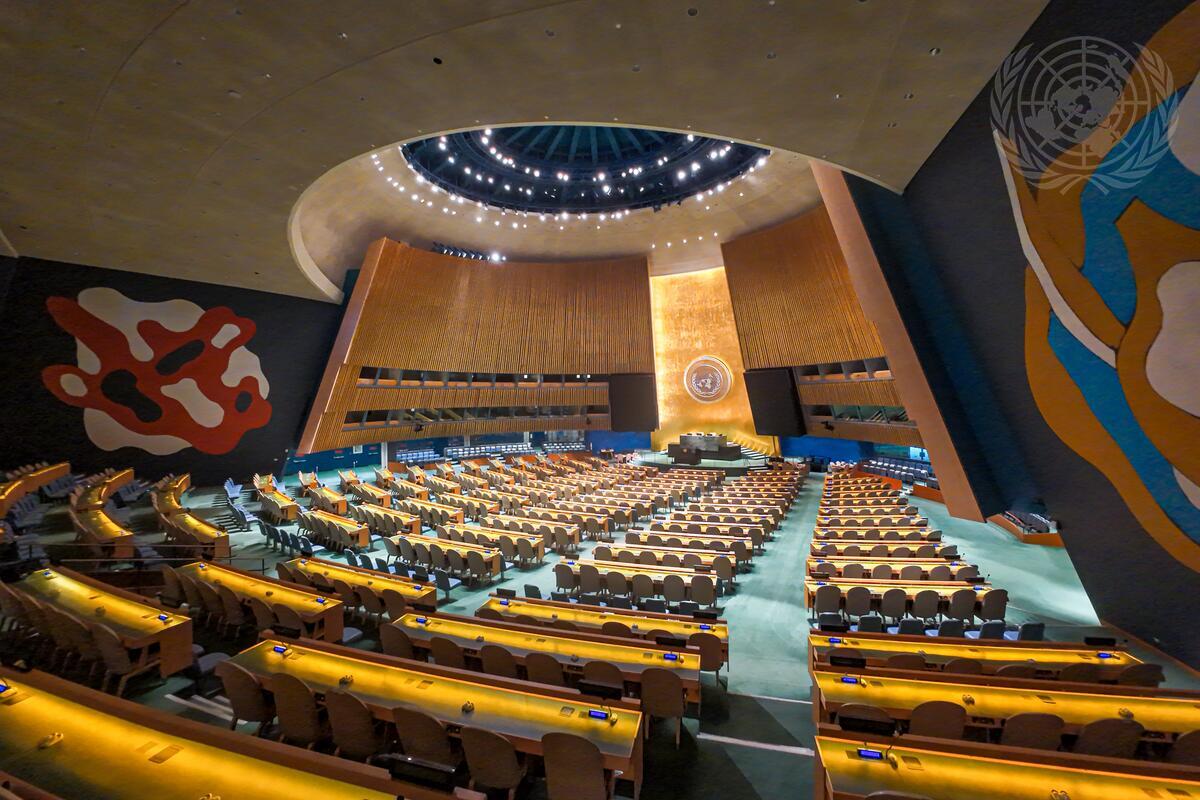 A wide view of the General Assembly Hall at UN Headquarters.