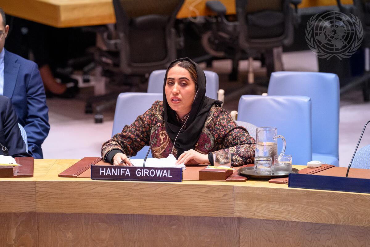 Hanifa Girowal briefs the Security Council meeting on the situation in Afghanistan.