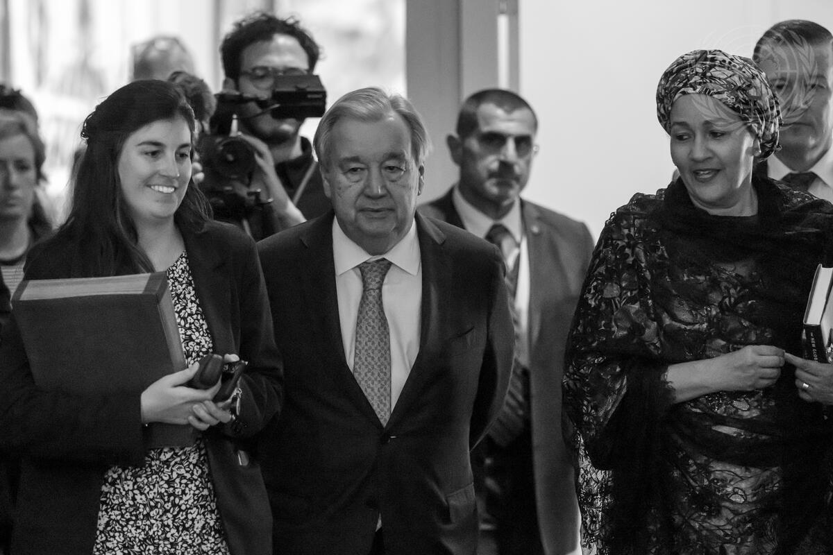 Secretary-General António Guterres (center) and Deputy Secretary-General Amina Mohammed (right) on their way to meet with the SDG Advocates. The SDG Advocates are 17 inspiring, influential people raising global awareness of the Sustainable Development Goals (SDGs) and the need for accelerated action.