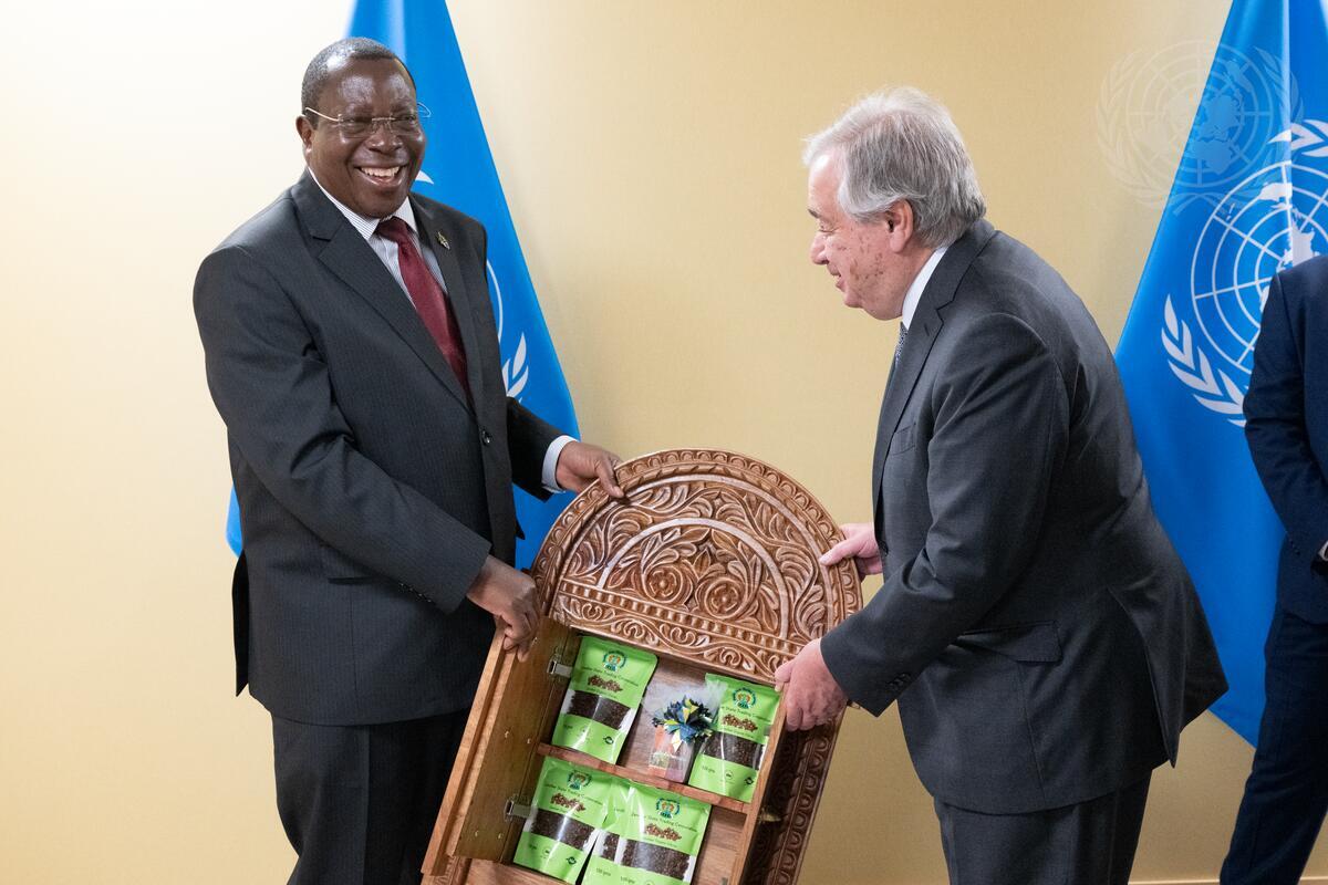 Secretary-General António Guterres (right) meets with Philip Mpango, Vice-President of the United Republic of Tanzania. The Secretary-General received a gift of spices from the Vice-President of Tanzania.