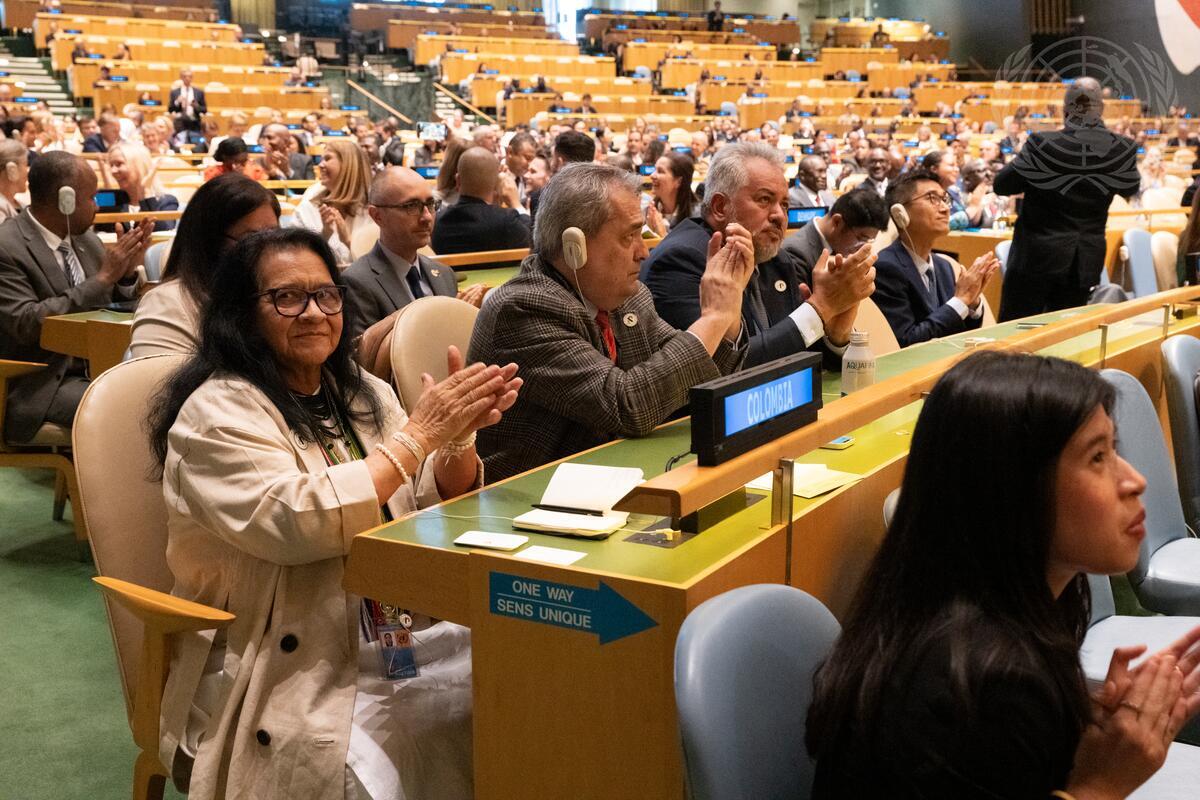 Leonor Zalabata Torres (left), Permanent Representative of the Republic of Colombia to the United Nations, and members of the Colombian delegation attend the 73rd plenary meeting of the General Assembly. The Assembly held election of non-permanent members of the Security Council. Bahrain, Colombia, the Democratic Republic of the Congo, Latvia, and Liberia were elected to serve as non-permanent members of the UN Security Council, with two-year terms beginning in January 2026.