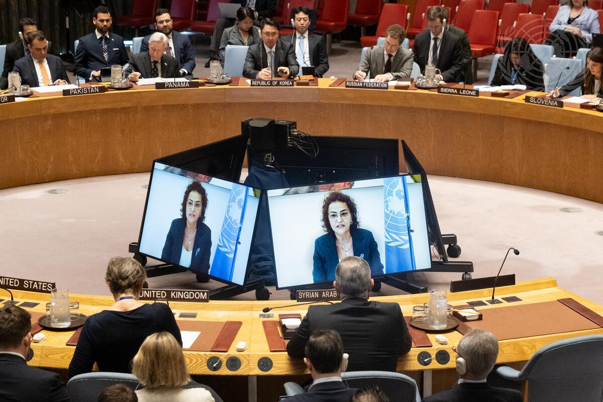 Najat Rochdi (on screens), Deputy Special Envoy of the Secretary-General for Syria, briefs the Security Council meeting on the situation in the Middle East (Syria).