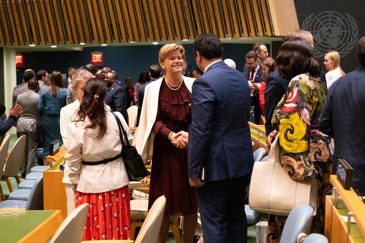 A delegate greets Baiba Braže (centre facing camera), Minister for Foreign Affairs of the Republic of Latvia, after the election of non-permanent members of the Security Council during the 73rd plenary meeting of the General Assembly. Bahrain, Colombia, the Democratic Republic of the Congo, Latvia, and Liberia were elected to serve as non-permanent members of the UN Security Council, with two-year terms beginning in January 2026.