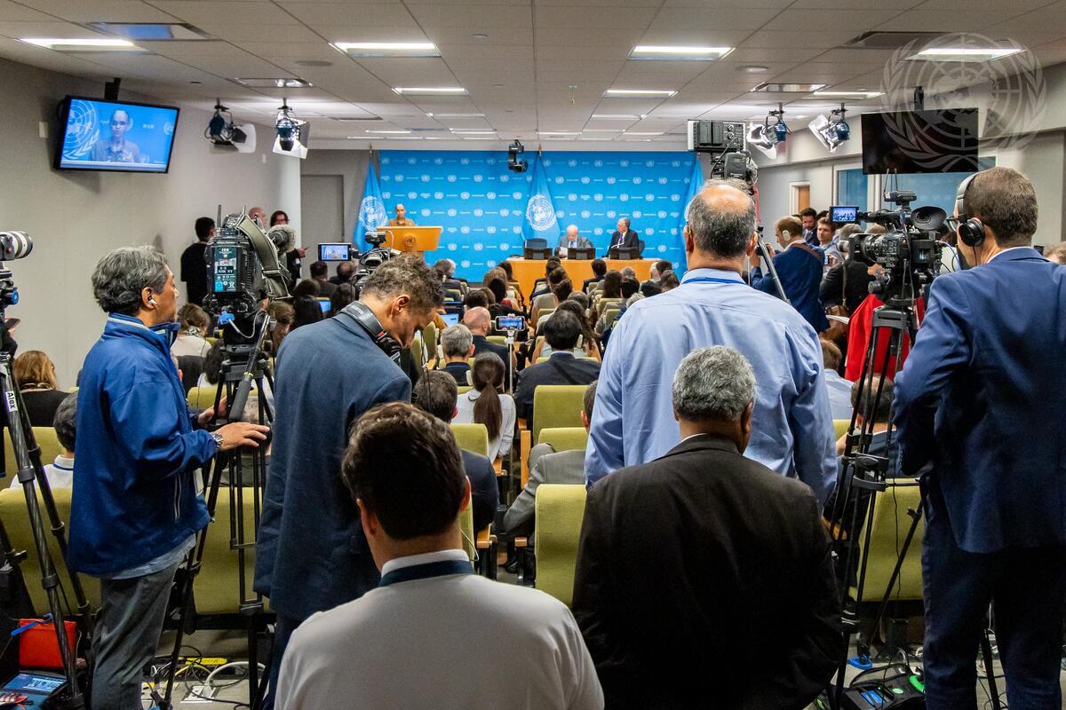 Maria Osmarina Marina da Silva Vaz de Lima (at podium), Minister of the Environment and Climate Change of Brazil briefs the press during the High-level Week of the 80th General Assembly. On dais is Luiz Inácio Lula da Silva (centre), President of the Federative Republic of Brazil and Sérgio França Danese, Permanent Representative of Brazil to the United Nations.