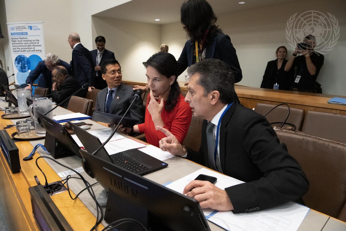 Annalena Baerbock (centre), President of the eightieth session of the United Nations General Assembly, speaks with with Movses Abelian (right), Under-Secretary-General for General Assembly and Conference Management (DGACM), before the start of the fourth UN High-Level Meeting on the Prevention of Noncommunicable Diseases and Mental Health (NCDs) titled “Equity and integration: transforming lives and livelihoods through leadership and action on noncommunicable diseases and the promotion of mental health and well-being". At her right is Lok Bahadur Thapa, Permanent Representative of Nepal and President of ECOSOC.