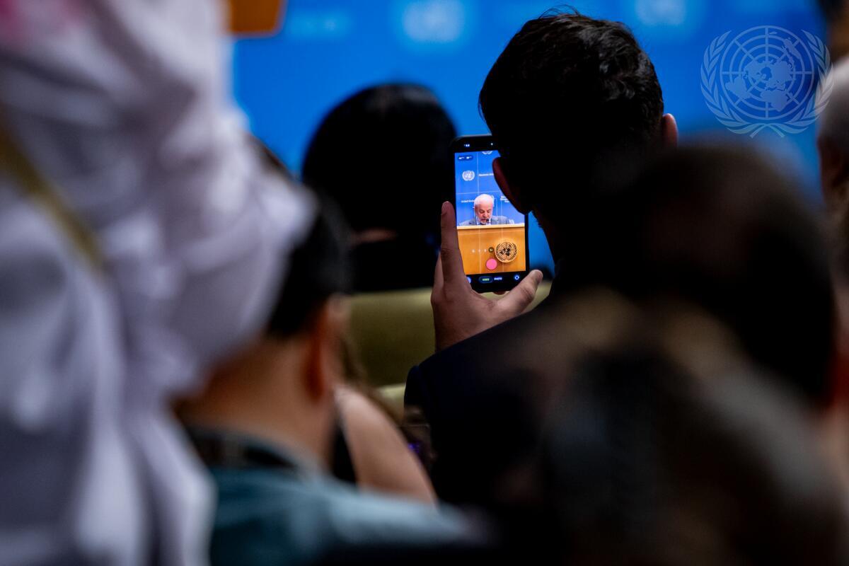 Luiz Inácio Lula da Silva (on screen), President of the Federative Republic of Brazil, briefs the press during the High-level Week of the 80th General Assembly.