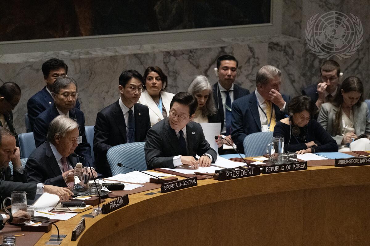 Lee Jae Myung (center), President of the Republic of Korea and President of the Security Council for the month of September, gives the floor to the Secretary-General António Guterres (second from left at table) for his address to the Security Council meeting on Artificial intelligence and international peace and security under the agenda item maintenance of international peace and security. At right is Lee Jae Myung, President of the Republic of Korea and President of the Security Council for the month of September, and at left is Javier Martínez Acha Vásquez, Minister for Foreign Affairs of Panama.