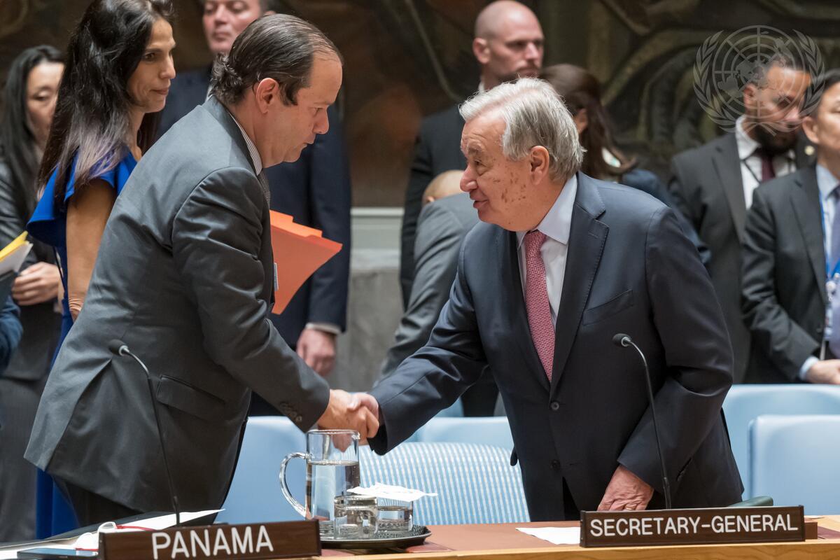 Secretary-General António Guterres (right) greets Javier Martínez Acha Vásquez, Minister for Foreign Affairs of Panama, ahead of the Security Council meeting on Artificial intelligence and international peace and security under the agenda item maintenance of international peace and security.