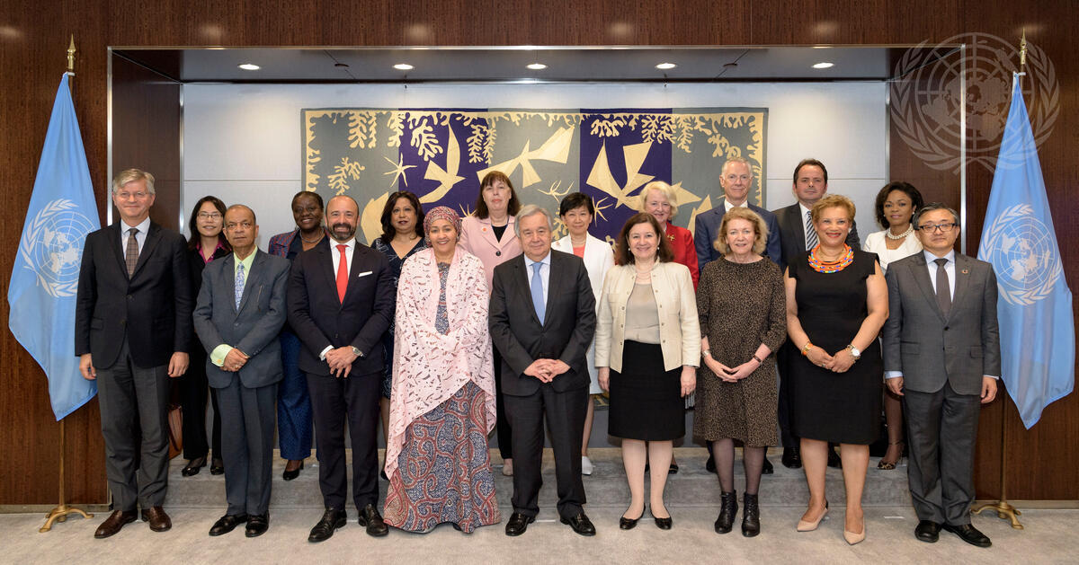 Pictured, front row (left to right): Jean-Pierre Lacroix, Under-Secretary-General for Peace Operations; Atul Khare, Under-Secretary-General for Operational Support; Migeul de Serpa Soares, Under-Secretary-General for Legal Affairs; Deputy Secretary-General Amina Mohammed; Secretary-General António Guterres; Chef de Cabinet Maria Luiza Ribeiro Viotti; Alison Smale, Under-Secretary-General for Global Communications; Catherine Pollard, Under-Secretary-General for General Assembly Affairs and Conference Management; Liu Zhenmin, Under-Secretary-General for Economic and Social Affairs. Pictured, back row (left to right): Elia Armstrong, Director of the Ethics Office; Bience Gawanas, Special Adviser on Africa; Pramila Patten, Special Representative of the Secretary-General on Sexual Violence in Conflict; Virginia Gamba, Special Representative of the Secretary-General for Children and Armed Conflict; Izumi Nakamitsu, High Representative for Disarmament Affairs; Jan Beagle, Under-Secretary-General for Management Strategy, Policy and Compliance; Peter Drennan, Under-Secretary-General for Safety and Security; Carlos Ruiz Massieu, Special Representative of the Secretary-General for Colombia and Head of the UN Verification Mission in Colombia, and Alayne Frankson-Wallace, Executive Director of the Office of Administration of Justice.