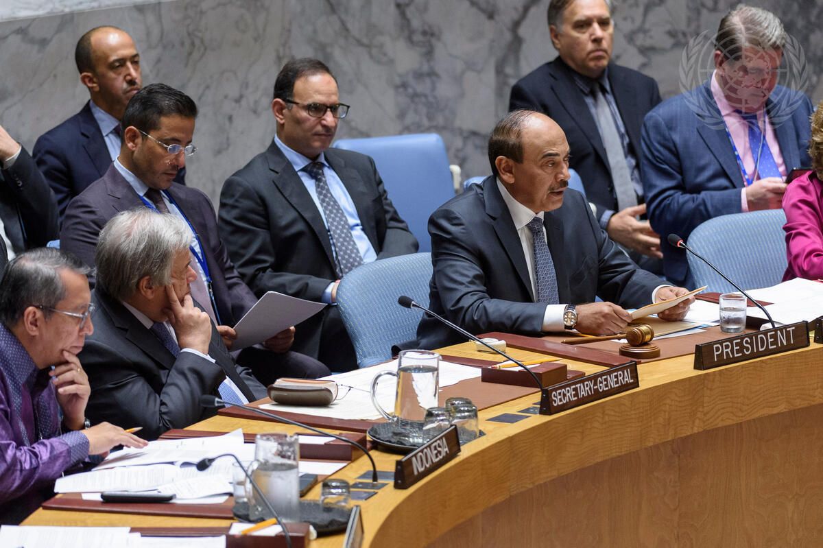 Sabah Khalid Al Hamad Al Sabah (right), Deputy Prime Minister and Minister for Foreign Affairs of Kuwait and Security Council President for the month of June, makes remarks during the Security Council meeting on cooperation between the Council and the League of Arab States. At left is Secretary-General António Guterres.