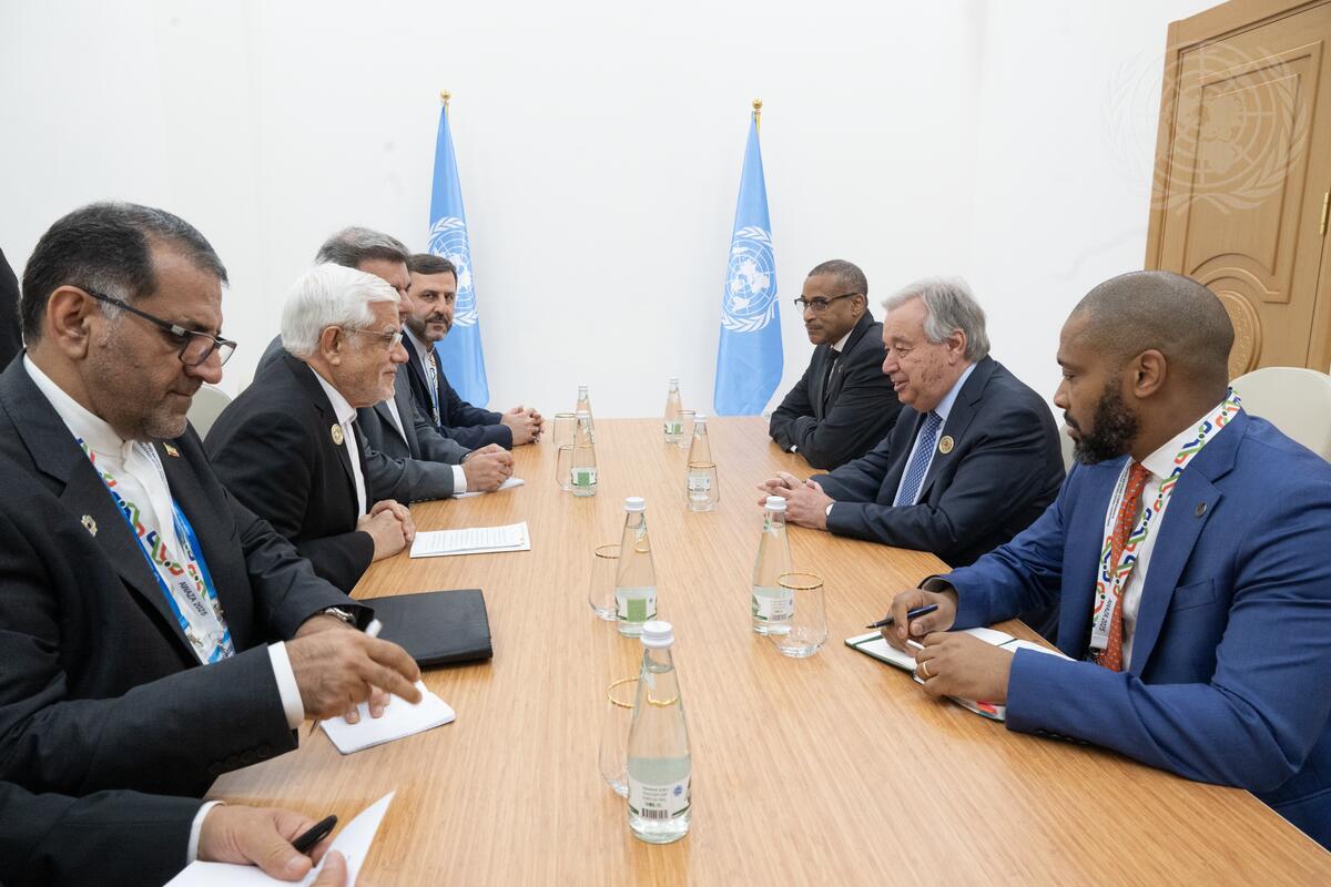 UN Secretary-General António Guterres (center right) meets Mohammed Mohammad Reza Aref (center left), First Vice-President of the Islamic Republic of Iran during the Third United Nations Conference on Landlocked Developing Countries, held in Awaza, Turkmenistan.