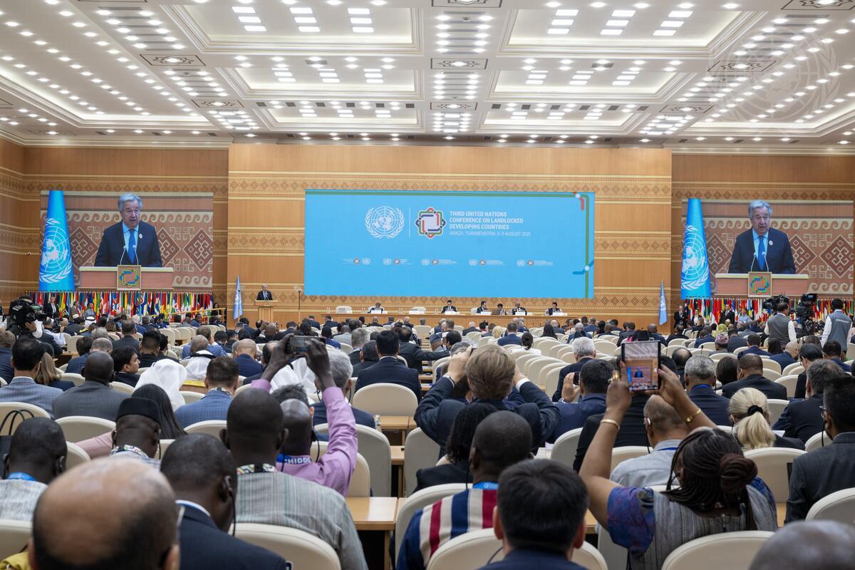UN Secretary-General António Guterres (on screen) speaks at the opening ceremony of the Third United Nations Conference on Landlocked Developing Countries, held in Awaza, Turkmenistan.