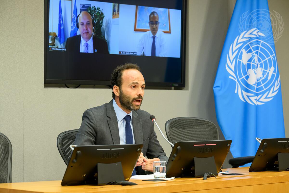 Samir Elhawary, Acting Deputy Director for Emergency Programmes at United Nations Children’s Fund (UNICEF) briefs reporters on the Integrated Food Security Phase Classification. On screen behind him are Rein Paulsen (left), Director of Office of Emergencies and Resilience at FAO and Jean-Martin Bauer, Director of Food Security and Nutrition Analysis Service at WFP.