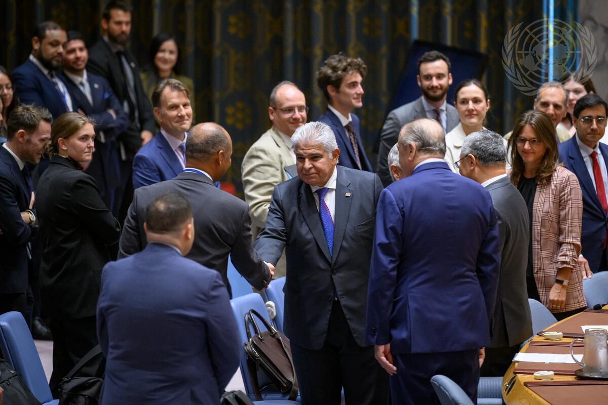 José Raúl Mulino Quintero (center), President of Panama and President of the Security Council for the Month of August, greets James Kariuki, Deputy Permanent Representative of United Kingdom to the UN, prior to the Security Council open debate on the theme Maritime Security: prevention, innovation, and international cooperation to address emerging challenges.