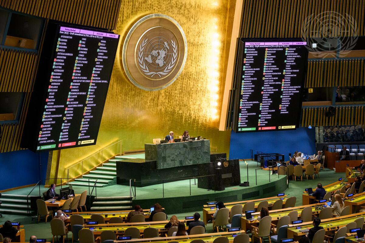 A view of the voting that resulted in an adoption of the Draft Amendment for Document A/79/L.120, by a recorded vote of 64 in favour to 26 against, with 37 abstentions, that replaces its annex, at the General Assembly plenary meeting on Outcomes of International Conferences on Financing for Development.