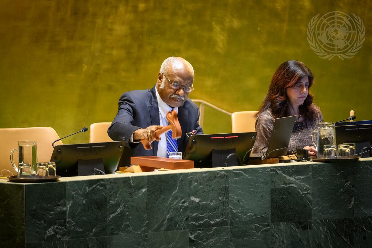Philemon Yang (left), President of the 79th session of the United Nations General Assembly, chairs the General Assembly plenary meeting on Outcomes of International Conferences on Financing for Development.
