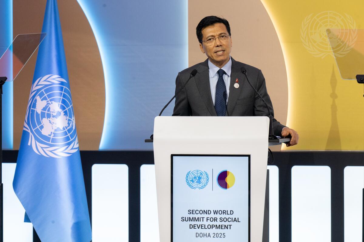 Lok Bahadur Thapa, President of the UN Economic and Social Council and Permanent Representative of Nepal to the United Nations, addresses the opening segment of the Second World Summit for Social Development.