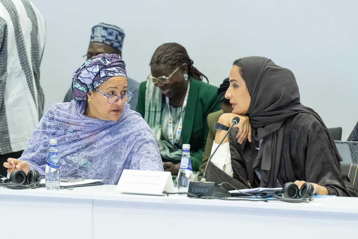 Deputy Secretary-General Amina Mohammed (left) speaks with Sheikha Hind bint Hamad bin Khalifa Al Thani, Vice Chairperson of the Qatar Foundation, during the high-level roundtable: A New Partnership to Accelerate the Achievement of the Sustainable Development Goals in Dryland Ecosystems, held during the Second World Summit for Social Development.
