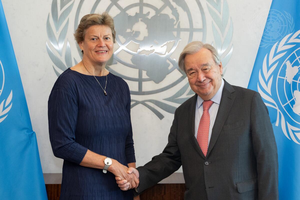 Barbara Woodward (left), Permanent Representative of the United Kingdom to the United Nations, pays a farewell call on Secretary-General António Guterres.