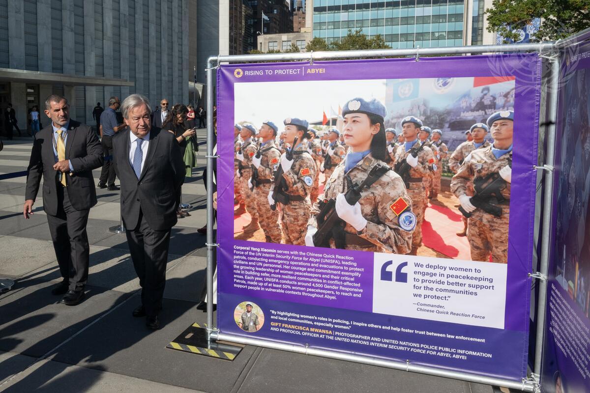 Secretary-General António Guterres (right) visits the exhibition “Through Her Lens: Women Rising for Peace” on the Visitors Plaza at UN Headquarters.