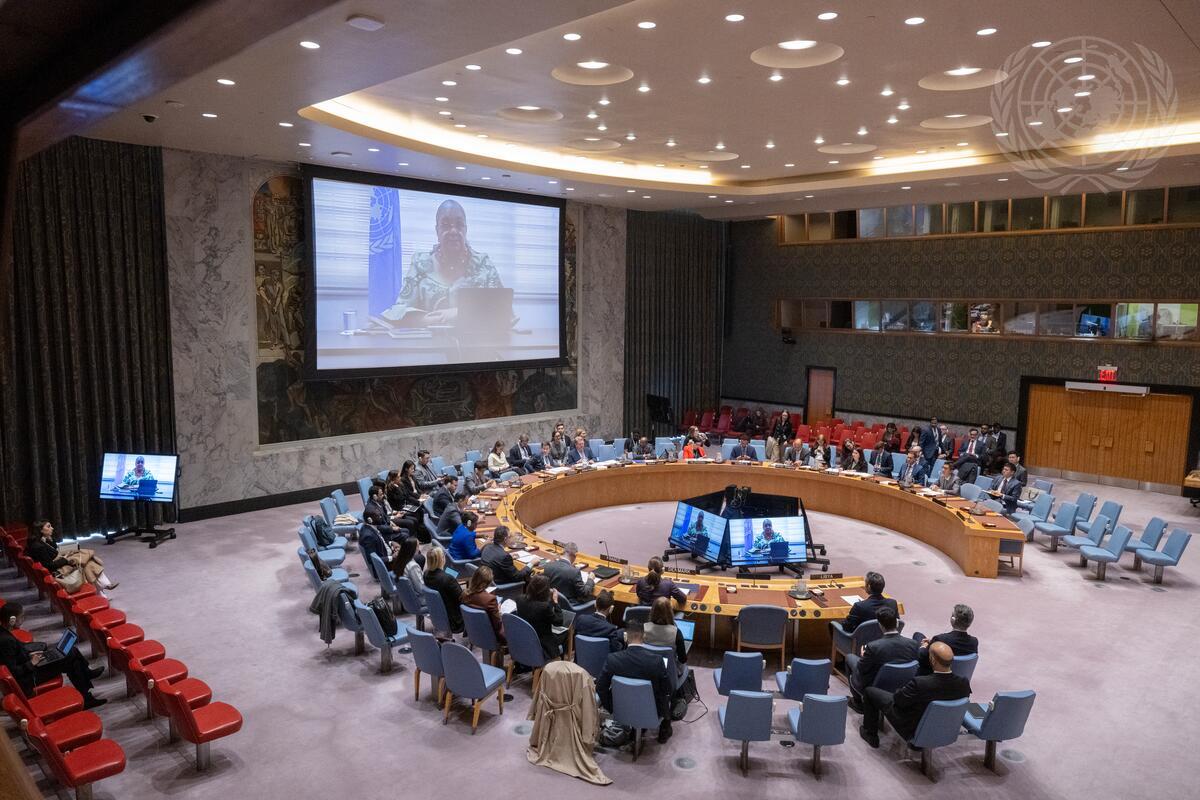 A wide view of the Security Council meeting on the situation in Libya. On the screens are Hanna Serwaa Tetteh, Special Representative of the Secretary-General for Libya and