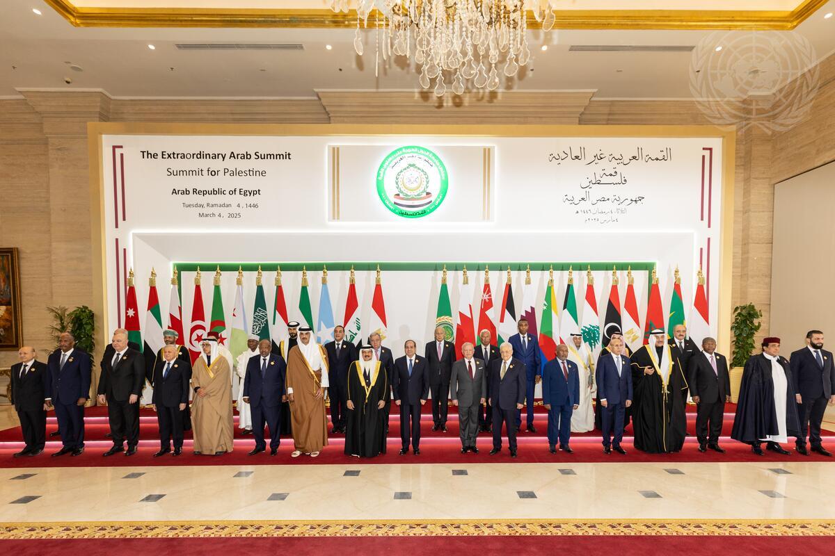 Secretary-General António Guterres (16th from right) with leaders attending the Extraordinary Arab Summit on the situation in the Middle East and on Gaza reconstruction held in Cairo, Egypt.