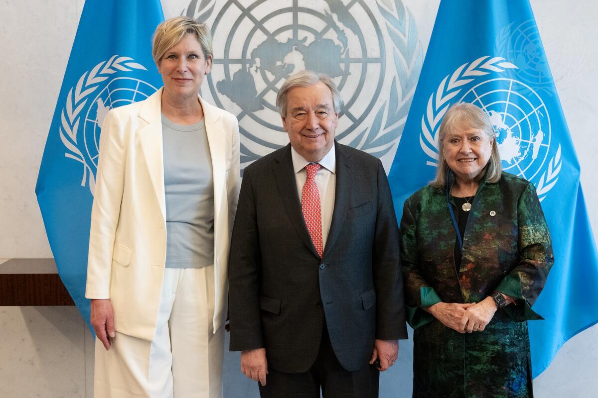Secretary-General António Guterres (centre) meets with Silvana Koch-Mehrin (left), President of Women Political Leaders, and Susana Malcorra, President of the Group of Women Leaders Voices.