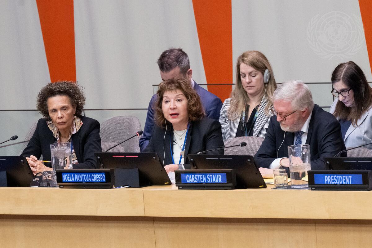 Noela Pantoja Crespo (centre), Executive Director of the Peruvian Agency for International Cooperation (APCI), addresses the opening of the 2025 Development Cooperation Forum of the Economic and Social Council (ECOSOC). The theme of the forum is “Transforming international development cooperation: from global dialogue to action.”