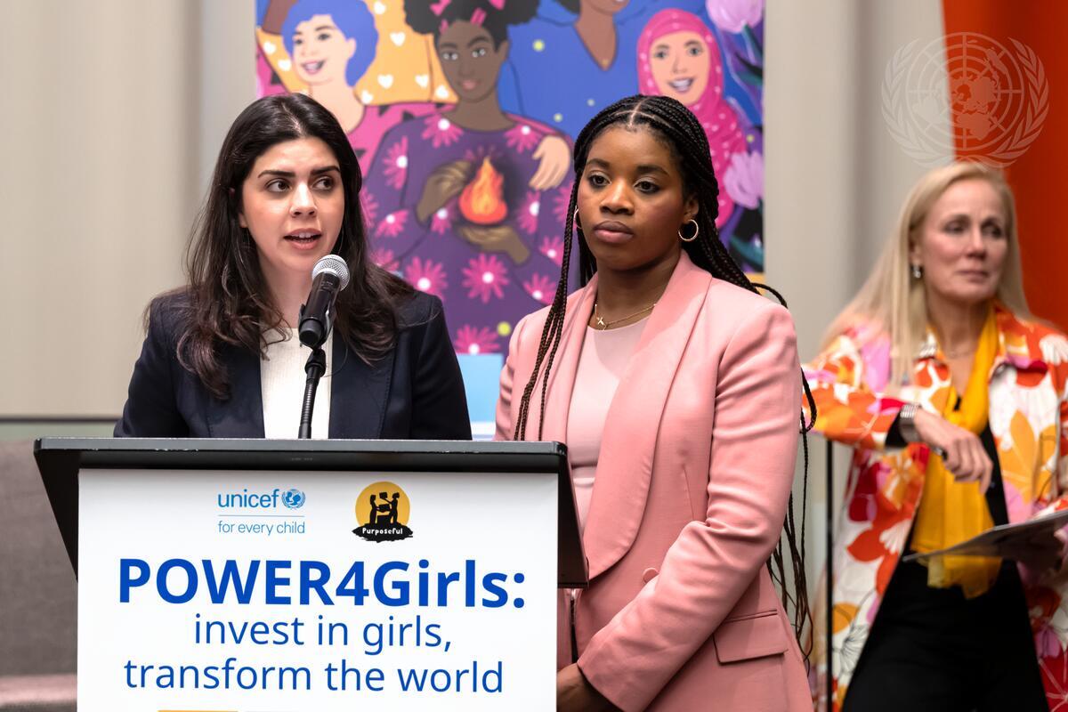 Fatma Tanis (left), Correspondent for NPR, and Alliyah Logan (centre), Co-Founder of Cultivate Global Education and UNICEF Global Girl Leaders Advisory Group alumna, the event titled “POWER4Girls: invest in girls, transform the world” on the occasion of the sixty-ninth session of the Commission on the Status of Women (CSW69/Beijing+30)
