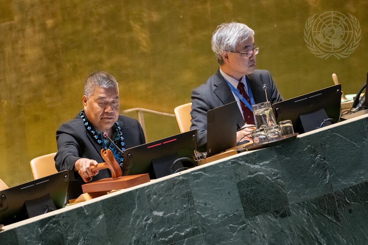 Jeem Lippwe (left), Vice-President of the seventy-ninth session of the United Nations General Assembly and Permanent Representative of the Federated States of Micronesia to the United Nations, chairs the meeting. At right is Kenji Nakano, Chief of the General Assembly Affairs Branch, Department for General Assembly and Conference Management (DGACM).