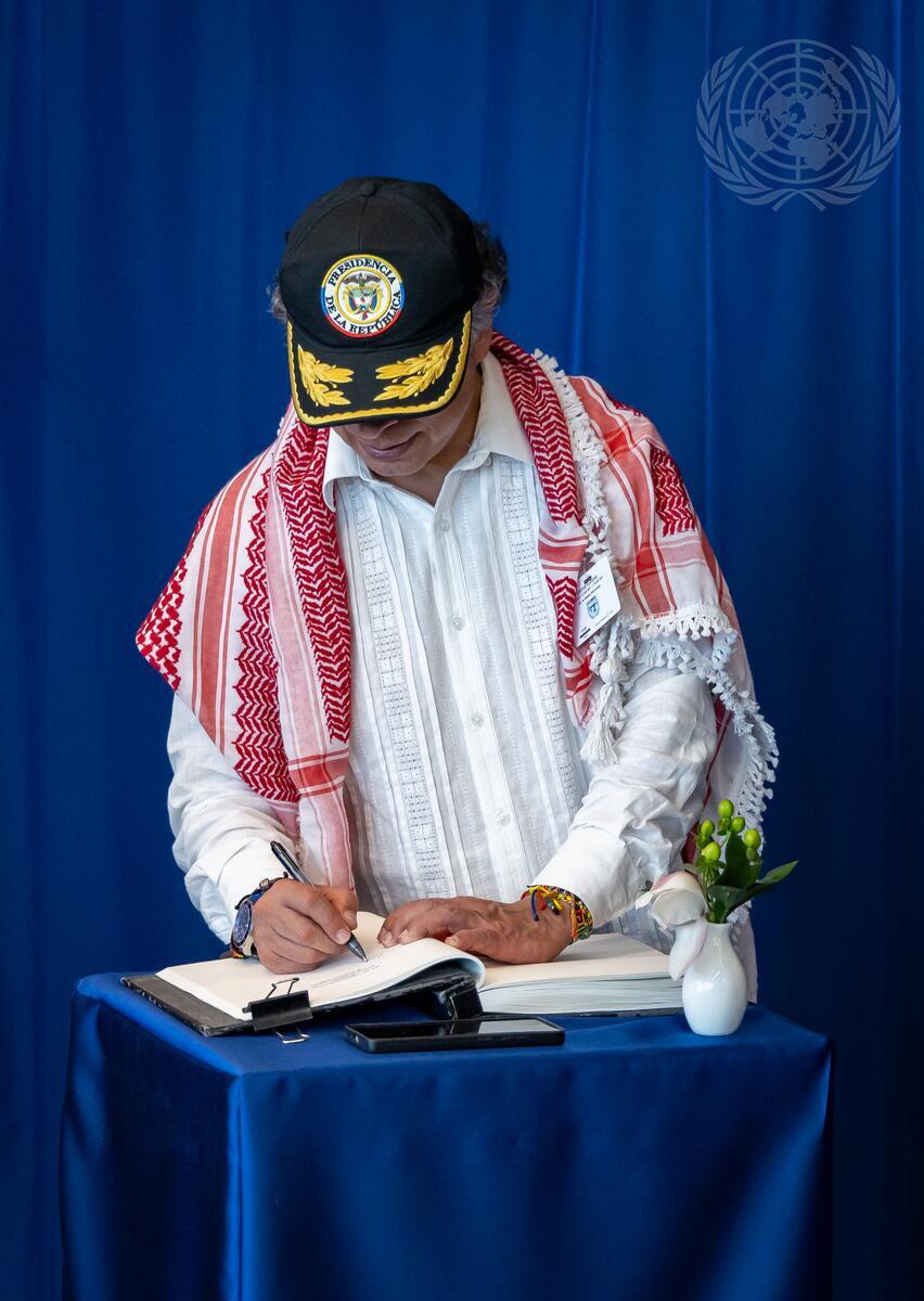 Gustavo Petro Urrego, President of the Republic of Colombia, signs the guest book as he meets with Secretary-General António Guterres (not pictured).