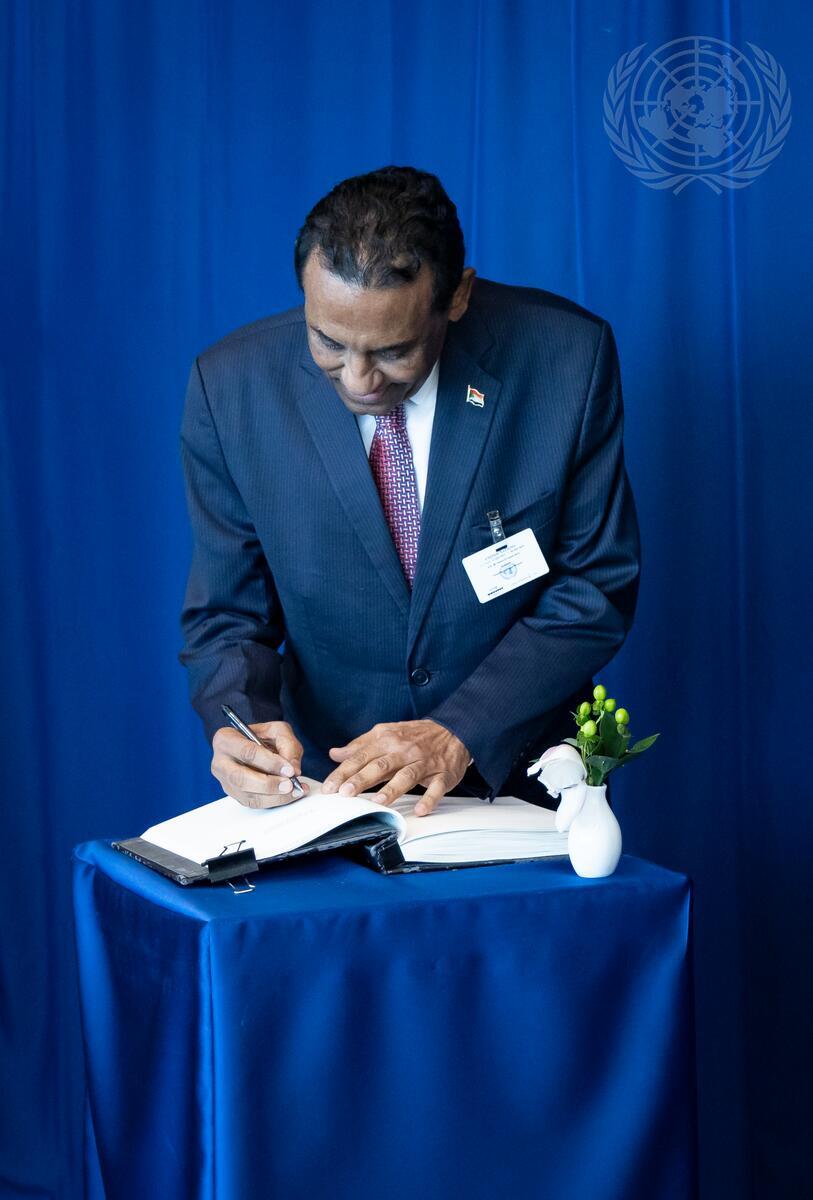 Kamil El-Tayeb Idris, Transitional Prime Minister of the Republic of the Sudan, signs the guest book as he meets with Secretary-General António Guterres (not pictured).