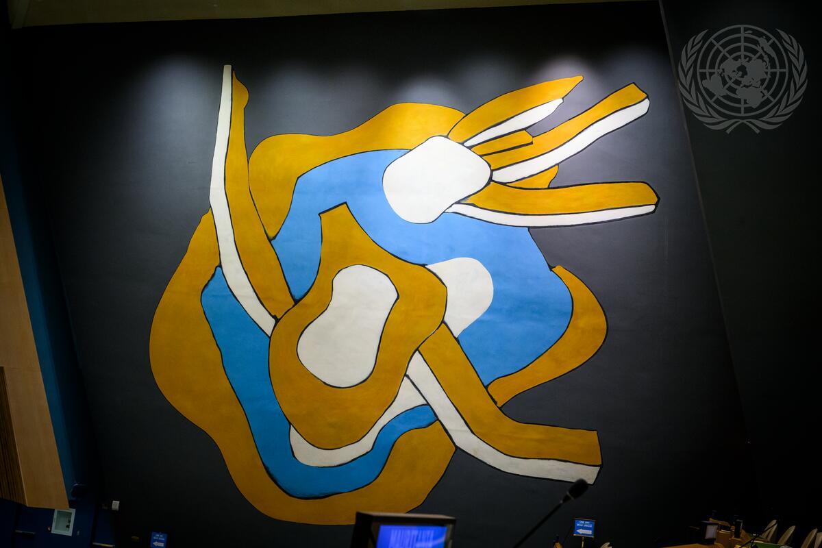 The two murals were painted on the east and west walls of the Hall by Mr. Bruce Gregory, who studied for two years in Paris with Fernand Leger. Mr. Gregory painted this mural, which is cadmium yellow, United Nations blue, and white on a dark grey background, from sketches by Leger.
