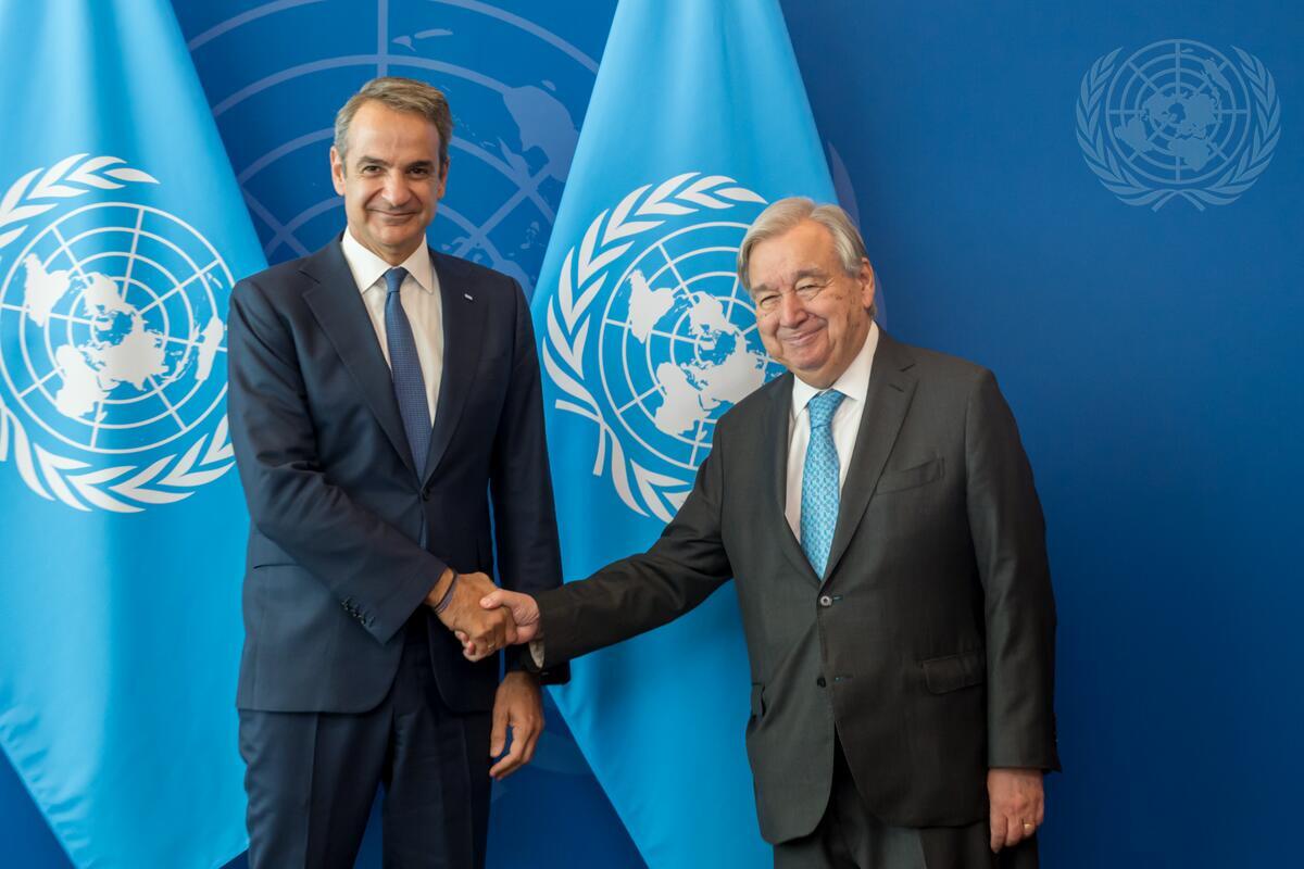 Secretary-General António Guterres (right) meets with Kyriakos Mitsotakis, Prime Minister of the Hellenic Republic.