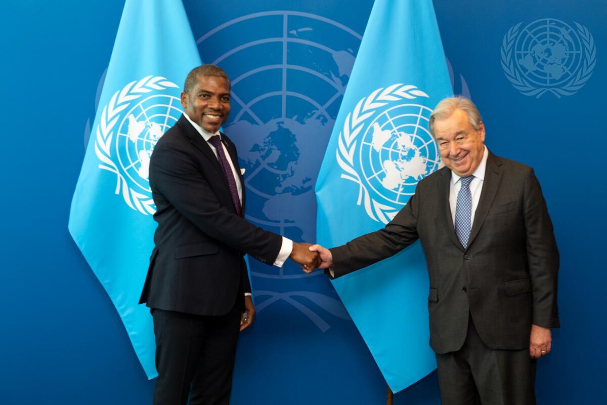 Secretary-General António Guterres (right) meets with Terrance Micheal Drew, Prime Minister and Minister for Finance, National Security and Immigration, Health, and Social Security of Saint Kitts and Nevis.