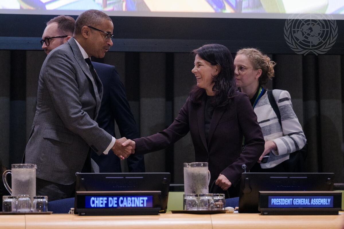 Annalena Baerbock (centre right), President of the eightieth session of the United Nations General Assembly, greets Courtenay Rattray (centre left), Chef de Cabinet of the Secretary-General, at the start of the high-level plenary meeting to commemorate and promote the International Day for the Total Elimination of Nuclear Weapons (26 September).